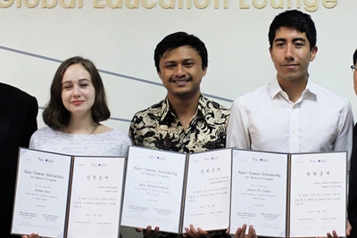 우리 학교 국제대학원과 (재)수원시국제교류센터가 지난 25일 율곡관에서 ‘아주-수원 석사과정 장학 지원 프로그램(ASSP)’ 장학금 수여식을 개최했다. ‘아주-수원 석사과정 장학 지원 프로그램(ASSP)’은 우리 학교 국제대학원과 수원시국제교류센터가 함께하는 장학사업으로 해외 우수 인재를 유치하고 있다. 올 하반기에는 수원시의 자매도시인 멕시코 똘루카시, 러시아 니즈니 노브고로드시, 인도네시아 반둥시의 추천을 받아 장학생으로 선발된 3명의 학생이 장학금을 받았다. 자모라 루이스 엔리큐(Zamora Luis Enrique), 랜키나 엘레나(Lenkina Elena), 이흐산 모하마드 카이룰(Ihsan Mochmad Chairul) 학생이 그 주인공이다.이날 행사에는 임재익 국제대학원장과 이선이 입학처장이 함께 자리했다. 수원시국제교류센터의 노만호 센터장, 하재명 팀장도 참석했다. ‘아주-수원 석사과정 장학 지원 프로그램’은 수원시의 국제자매·우호도시의 우수한 인재를 유치해 지역 경쟁력을 강화하고, 국제교류 인프라를 구축하기 위해 2014년부터 실시하고 있는 장학 사업이다. 수원시는 전세계 13개국의 16개 도시와 자매·우호도시 관계를 맺고 있다.임재익 국제대학원장은 “아주대학교와 수원시가 지난 4년 간 긴밀히 협력해 우수 유학생을 유치해왔다"며 "이 사례가 실질적인 관-학 협력 국제 교류의 모범적 사례가 될 것으로 기대한다”고 말했다.노만호 수원시 국제교류센터장은 “‘아주-수원 석사과정 장학 지원 프로그램’에 지원하는 외국 학생들이 계속 늘고 있다"며 "수원시와 아주대를 널리 알리는 데 큰 몫을 하고 있다”고 전했다.우리 학교는 올해 ‘아주-수원 석사과정 장학 지원 프로그램’으로 총 5명의 학생을 선발했다. 현재 이 프로그램을 통해 모로코, 베트남, 브라질, 중국, 멕시코, 러시아, 인도네시아 출신 학생 10명이 우리 학교에 재학하고 있다.