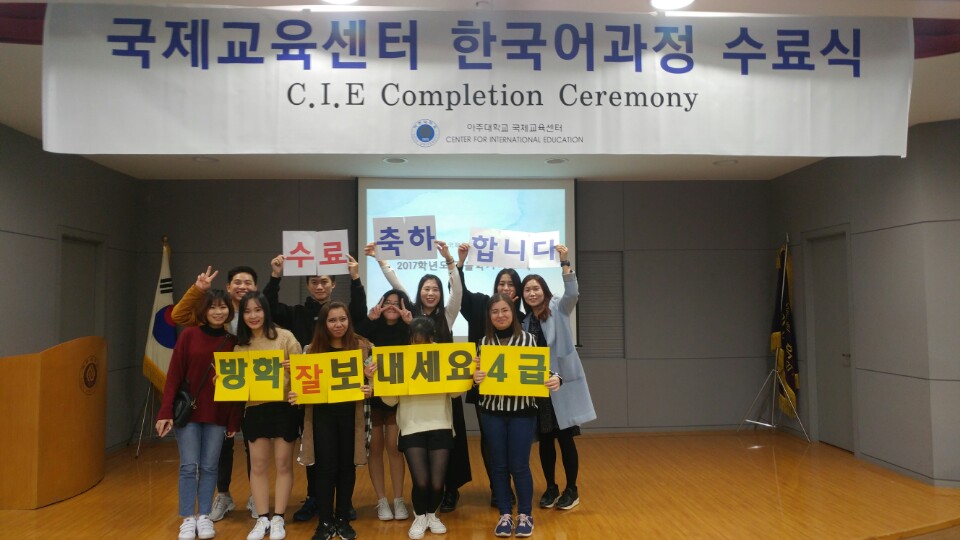 아주대학교 국제교육센터는 지난 28일 2017학년도 가을학기 한국어과정 수료식을 개최하였다. 국제교육센터 가을학기 한국어과정은 일반한국어과정(AKP)과 학부예비과정(AFP)의 176명 학생을 대상으로 10주 동안 교육을 진행하였다. 수료식은 자국을 떠나 추운 날씨에 열심히 공부한 학생들을 격려하고 수료를 축하하는 축사를 시작으로 수료증 수여, 성적우수상 시상, 수료소감 발표 순서로 이루어졌다. 총 127명의 학생이 가을학기 한국어과정을 수료했고 수료증을 수여받았다." src="/_resources/_upload_image/2017-11/jmmxhnpgpuau.jpg"> 성적우수상에는 학비감면의 장학혜택이 수여되며, 1단계 4명, 2단계 4명, 3단계 2명, 4단계 1명, 5단계 1명, 총 12명의 학생에게 장학금이 전달되었다.학생들은 2주 간의 짧은 방학을 보내고, 12월14일부터 겨울학기 한국어과정을 수학할 예정이다.