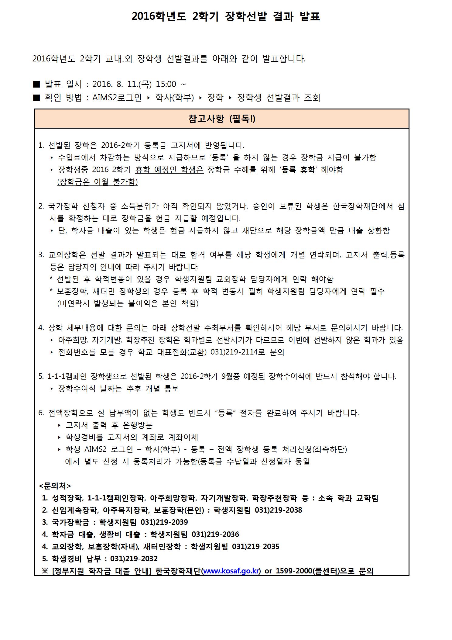 2016학년도 2학기 장학선발 결과발표