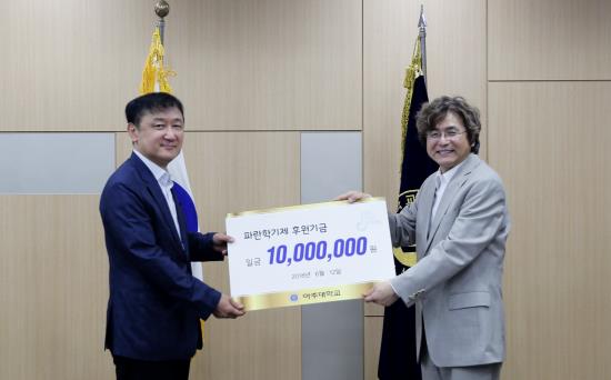 지난 6월 12일과 21일, 한만엽·서정혁 기부자에 대한 감사패 전달식이 열렸다. 한만엽 교수(건설시스템공학과, 위 사진 왼쪽)는 파란학기제 후원기금으로, 서정혁 학부모(메리앤비 대표이사)는 어려운 학생들을 위한 장학금으로 각각 1000만원을 쾌척했다.한만엽 교수에 대한 감사패 전달식은 지난 12일 총장실에서 열렸다. 한 교수는 우리 학교가 운영 중인 ‘파란학기제 – 아주 도전학기 프로그램’ 참가자들을 위해 후원기금 1000만원을 쾌척했다. 한만엽 교수는 파란학기제 후원기금으로 5000만원 기부를 약정했다.한 교수는 파란학기제 출범부터, 학생들의 도전을 응원하기 위해 기부금을 쾌척해왔으며 그에 앞서 건설시스템공학과 학생들을 위한 장학금으로도 꾸준히 기부를 실천해왔다.학부모 서정혁 님에 대한 감사패 전달식은 21일 오후 열렸다. 우리 학교 신입생 서윤재 학생의 아버지인 서정혁 메리앤비 대표이사는 어려운 환경에서도 열심히 생활하는 학생들을 위해 써달라며 1000만원을 기부했다. 서 대표는 5000만원 기부를 약정했다. 이 기금은 ‘마티덤 장학’으로 활용될 예정이다. 기부자 감사패 전달식에는 박형주 총장과 최정주 기획처장, 조재형 학생처장을 비롯한 학교 관계자들이 함께 자리해 고마움을 전했다.